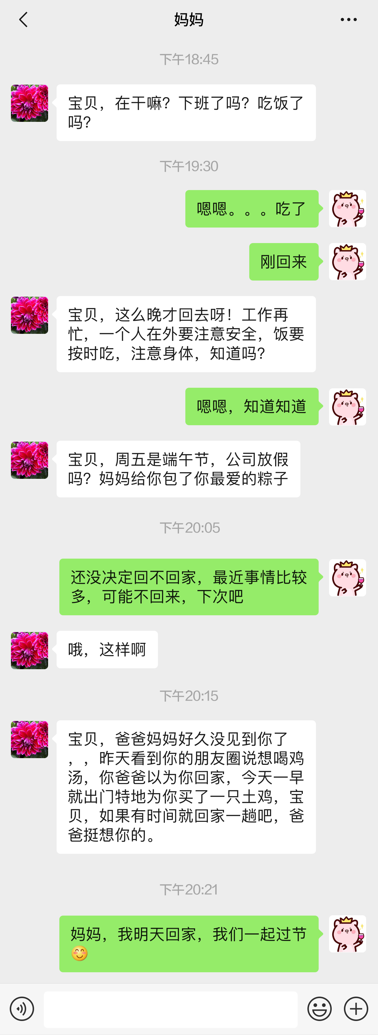 聊天記錄里的女孩叫莉莉,是一位北漂女孩,和中國大多數(shù)的青年人一樣,懷揣著夢想和激情,只身來到心中的殿堂,尋找著一份屬于自己的耀眼光芒。距離上次回家,還是去年春節(jié)長假,已有半年之久。在如今這個拼搏就會成功、時間就是金錢的世界里,還有很多很多莉莉,他(她)們,可能一個月、三個月、六個月、一年,甚至幾年都沒有回過家,見過父母,那么朋友的你是否也是其中一員?是否也有很久沒見過父母,是否已經(jīng)忘記和父母最近一次吃飯是什么時候?
