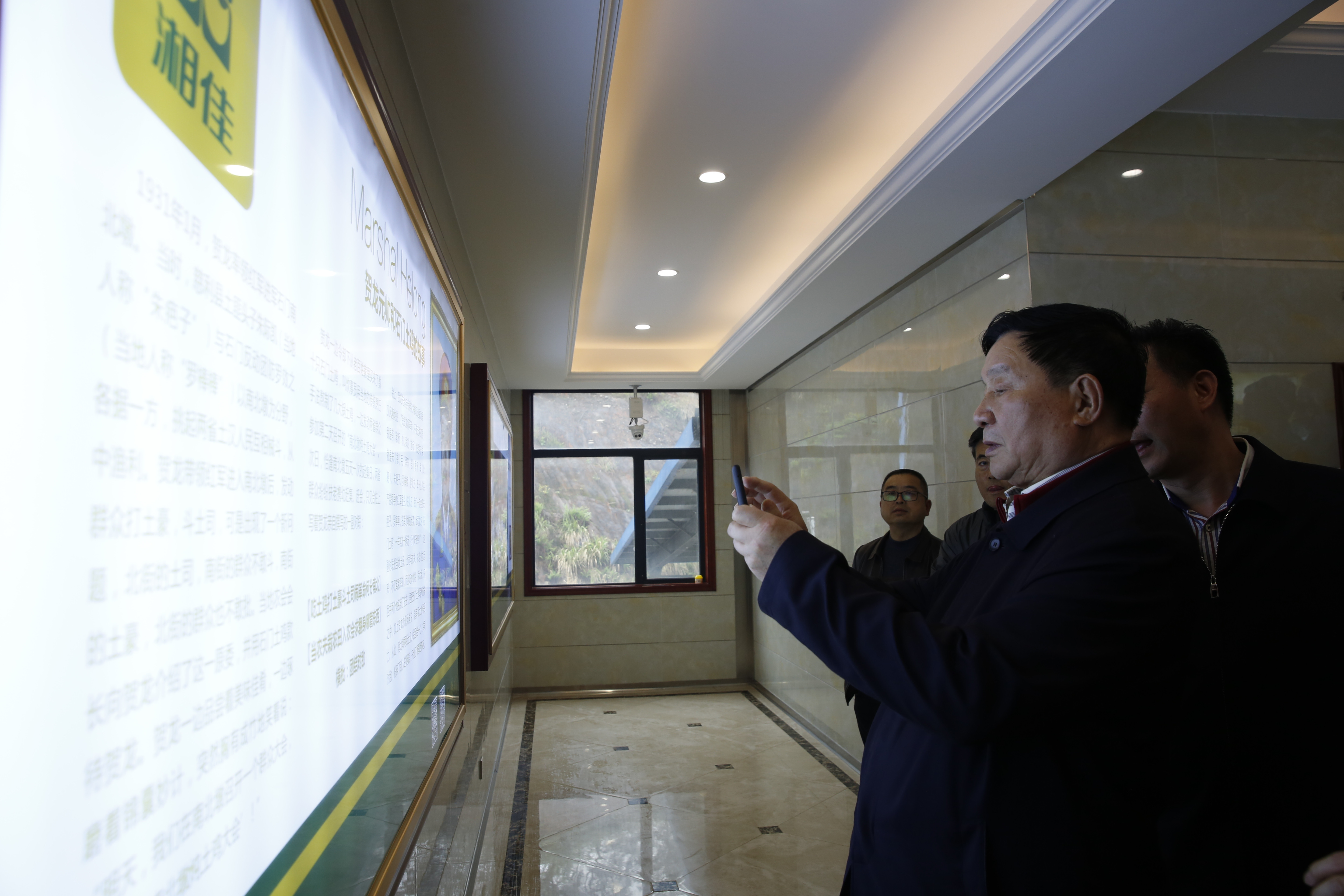參觀途中,講解員介紹到,湘佳現(xiàn)代農(nóng)業(yè)利用雞糞生產(chǎn)加工有機(jī)肥,廣泛施用于水果、蔬菜、茶葉、水稻、油茶、中藥材、花木等作物栽培,有效地改良了土壤結(jié)構(gòu),提高了農(nóng)作物品質(zhì),受到了各地農(nóng)民的喜歡。 看到賀龍與石門土雞的故事將軍連拍了幾張照片… 參觀途中,文化長廊里的一扇櫥窗,吸引了唐天標(biāo)的目光,那扇櫥窗展示的是賀龍?jiān)獛浐褪T土雞的故事—— 1931年,賀龍率領(lǐng)紅軍進(jìn)駐湘鄂邊界南北墩,當(dāng)?shù)氐耐了?、土豪挑起兩省百姓械斗,從中漁利。為了發(fā)動兩省邊界的老百姓團(tuán)結(jié)起來,打土豪分田地,賀龍別出心裁,利用趕集日,搞了一場“南北墩燉土雞大會”,還親自寫了一副對聯(lián)—— 吃土雞打土豪斗土司鬧革命何分南北 當(dāng)農(nóng)夫栽農(nóng)田入農(nóng)會求翻身哪管東西 橫批:團(tuán)結(jié)對敵 唐天標(biāo)仔細(xì)地欣賞著這副對聯(lián),連聲說“好故事!好對子!”并拿起手機(jī),連拍了幾張照片,留作紀(jì)念。